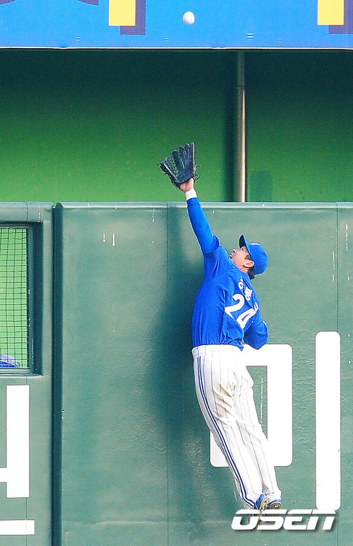 ] '2011 롯데카드 프로야구 한국시리즈' 4차전 SK 와이번스와 삼성 라이온즈의 경기 7회말 무사 주자 1,2루 SK 박재상의 좌월 스리런 홈런 타구를 잡기 위해 삼성 좌익수 강봉규가 담장으로 뛰어올랐지만 잡아내지 못하고 있다.