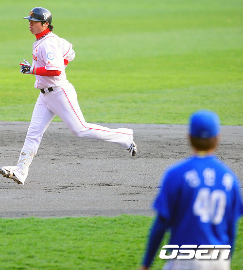 ] '2011 롯데카드 프로야구 한국시리즈' 4차전 SK 와이번스와 삼성 라이온즈의 경기 7회말 무사 주자 1,2루 SK 박재상이 좌월 스리런 홈런을 날린 후 그라운드를 돌고 있다.