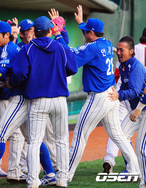 ] '2011 롯데카드 프로야구 한국시리즈' 4차전 SK 와이번스와 삼성 라이온즈의 경기 7회말 무사 주자 1,3루의 위기를 막아낸 삼성 안지만이 덕아웃에서 동료들과 기쁨을 나누고 있다.