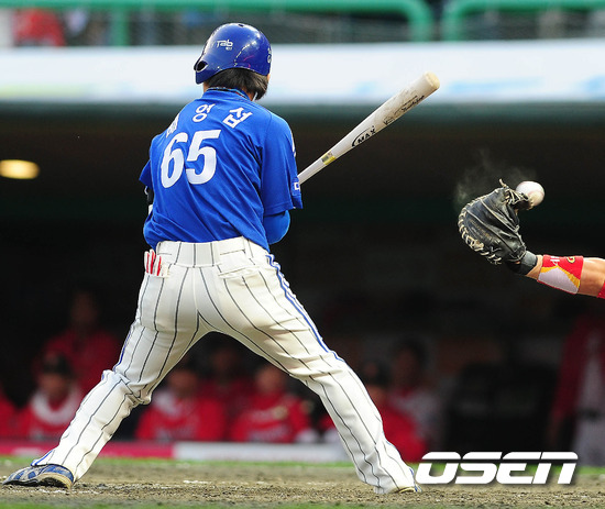 '2011 롯데카드 프로야구 한국시리즈' 4차전 SK 와이번스와 삼성 라이온즈의 경기 8회초 1사 만루 배영섭이 밀어내기 사구를 맞고 있다.