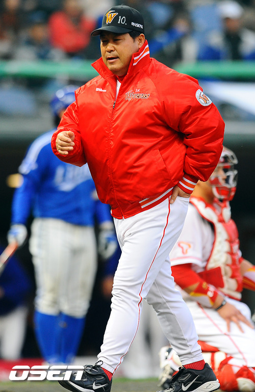 29일 오후 인천 문학구장서 열린 '2011 롯데카드 프로야구 한국시리즈 4차전' SK 와이번스와 삼성 라이온즈의 경기 8회말 1사 만루 상황에서 SK 박희수 투수가 삼성 배영섭에게 몸에 맞는 공으로 밀어내기 실점을 했다. 이에 이만수 감독대행이 판정에 항의한후 더그아웃으로 들어가고 있다.