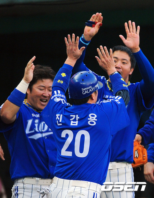 ] '2011 롯데카드 프로야구 한국시리즈' 4차전 SK 와이번스와 삼성 라이온즈의 경기에서 1사 주자 만루 조동찬의 유격수 앞 안타때 홈을 밟은 진갑용이 덕아웃에서 최형우 채태인과 기쁨을 나누고 있다.