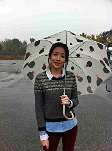 사진 속 최정원은 비가 오는 날씨 탓에 우산을 쓰고, 하늘색 셔츠와 회색 니트티에 붉은 톤 바지를 입어 수수한 모습을 선보였다.