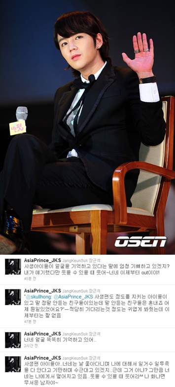 최근 한류 최고스타로 급부상한 장근석은 30일 자신의 트위터에 "사생팬 아이들아. 너네는 날 쫓아다니며 나에 대해서 일거수일투족을 다 안다고 기만하며 수근 대고 있겠지. 근데 그거 아냐? 그만큼 너네는 나에게서 멀어지고 있음. 웃을 수 있을 때 웃어라^^ 나 화나면 무서운 남자야~"라는 글로 사생팬들을 향해 경고의 메시지를 남겼다.