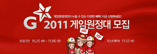 ‘2011 지스타 게임원정대’는 게임을 좋아하는 부산 거주 고등학생이면 누구나 신청할 수 있으며, 다음달 6일까지 피망 홈페이지를 통해 접수하면 된다. 참가비는 무료로 참석자 중 추첨을 통해 총 50명에게 다양한 경품이 증정된다. 당첨자 발표는 11월 8일이다.