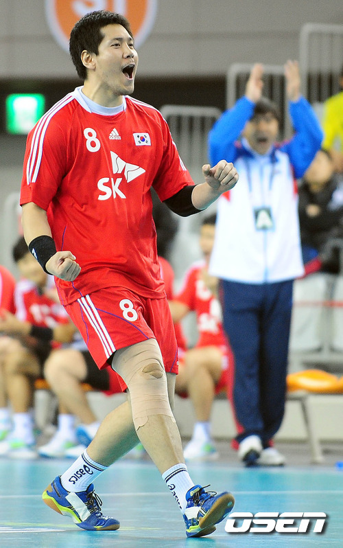 [OSEN= 올림픽공원 ,백승철 인턴기자] 31일 오후 서울 방이동 올림픽공원 SK 올림픽핸드볼경기장에서 열린 한국과 이란의 2012 런던올림픽 남자 핸드볼 아시아지역 준결승 경기 전반 한국이 골을 넣자 박중규가 기뻐하고 있다.