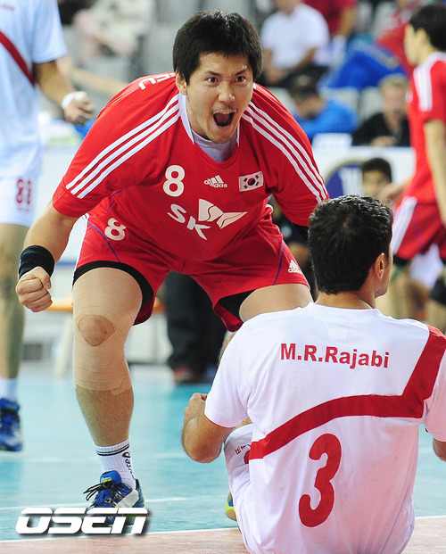 [OSEN= 올림픽공원 ,백승철 인턴기자] 31일 오후 서울 방이동 올림픽공원 SK 올림픽핸드볼경기장에서 열린 한국과 이란의 2012 런던올림픽 남자 핸드볼 아시아지역 준결승 경기 전반 박중규가 골을 넣은 후 기뻐하고 있다.