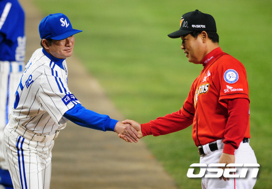 '2011 롯데카드 프로야구 한국시리즈' 5차전 삼성 라이온즈와 SK 와이번스의 경기에 앞서 삼성 류중일 감독과 SK 이만수 감독대행이 악수를 나누고 있다.