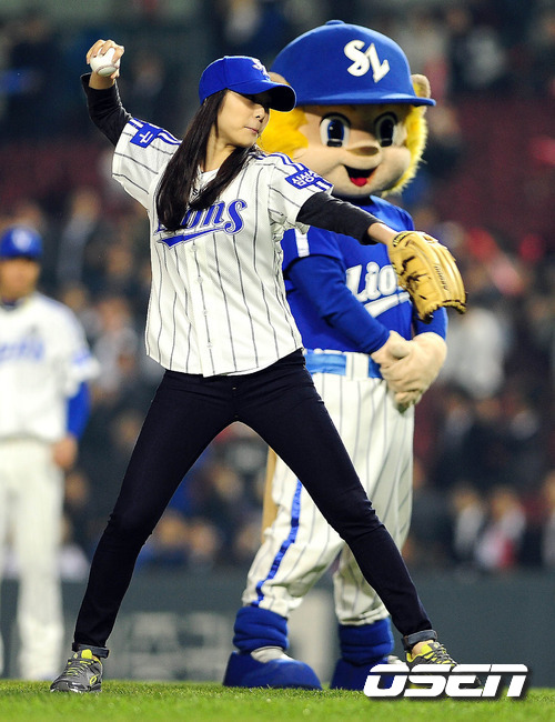 '2011 롯데카드 프로야구 한국시리즈' 5차전 삼성 라이온즈와 SK 와이번스의 경기에 앞서 김연아가 멋진 폼으로 시구를 하고 있다.