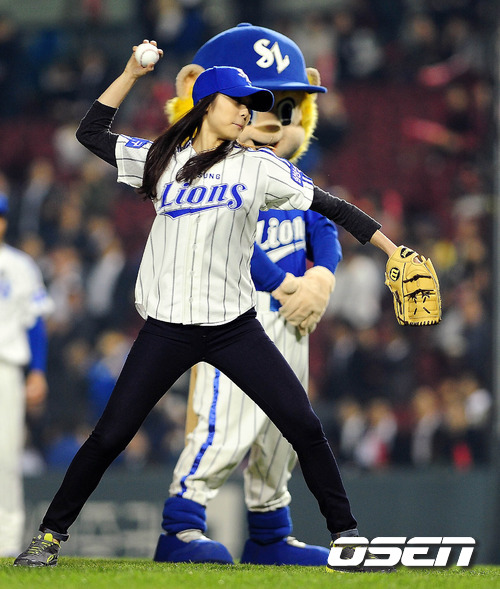 '2011 롯데카드 프로야구 한국시리즈' 5차전 삼성 라이온즈와 SK 와이번스의 경기에 앞서 김연아가 멋진 폼으로 시구를 하고 있다.
