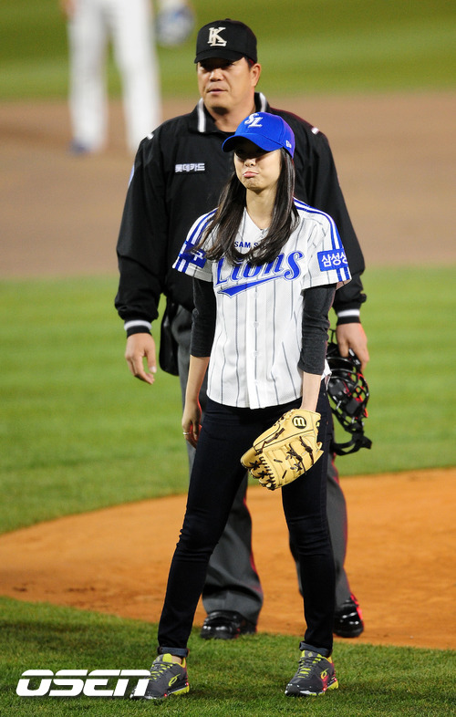 '2011 롯데카드 프로야구 한국시리즈' 5차전 삼성 라이온즈와 SK 와이번스의 경기에 앞서 김연아가 시구를 마치고 아쉬워하고 있다.