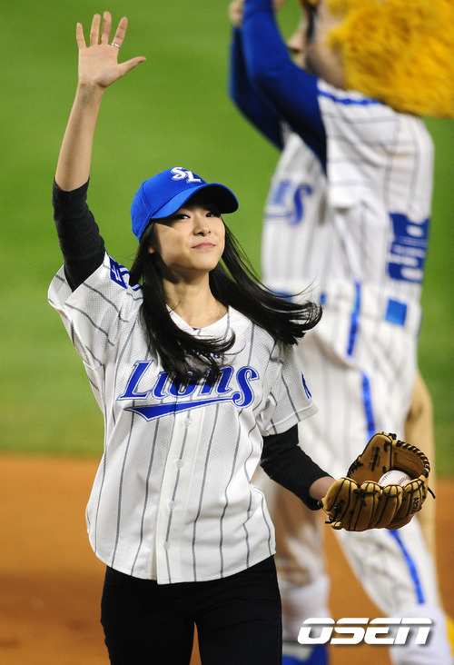 '2011 롯데카드 프로야구 한국시리즈' 5차전 삼성 라이온즈와 SK 와이번스의 경기에 앞서 김연아가 멋진 폼으로 시구를 하고 팬들에게 인사를 하고 있다.