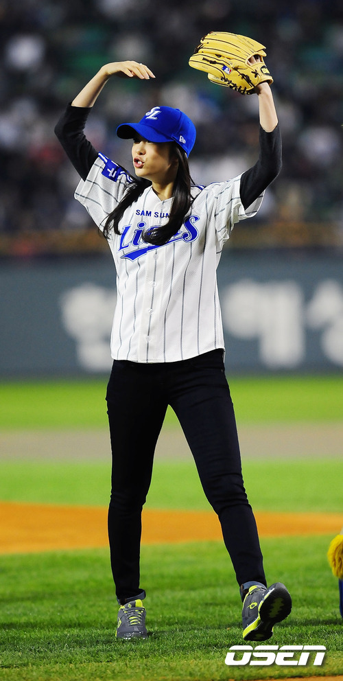'2011 롯데카드 프로야구 한국시리즈' 5차전 삼성 라이온즈와 SK 와이번스의 경기에 앞서 김연아가 멋진 폼으로 시구를 마친 후 사인을 보내고 있다.