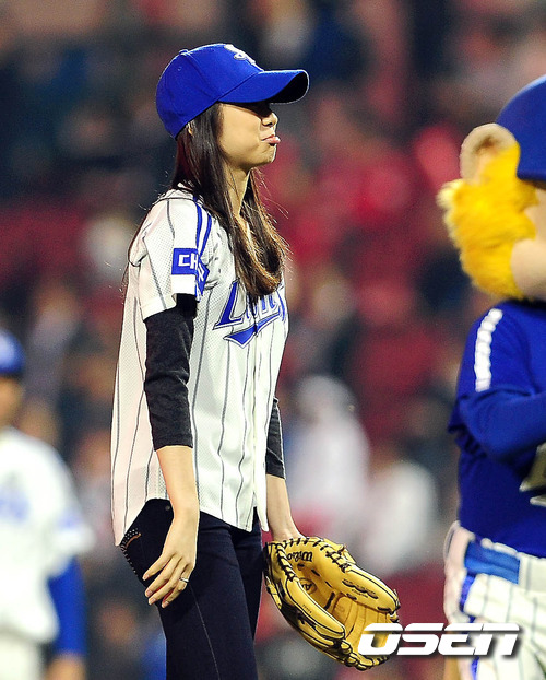 '2011 롯데카드 프로야구 한국시리즈' 5차전 삼성 라이온즈와 SK 와이번스의 경기에 앞서 김연아가 멋진 폼으로 시구를 하고 있다.