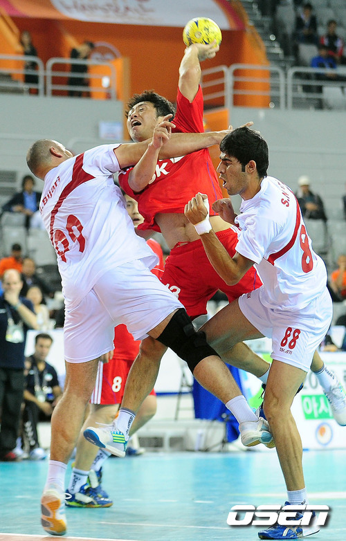 [OSEN= 올림픽공원 ,백승철 인턴기자] 31일 오후 서울 방이동 올림픽공원 SK 올림픽핸드볼경기장에서 열린 한국과 이란의 2012 런던올림픽 남자 핸드볼 아시아지역 준결승 경기 후반 이재우가 이란 수비에 막히고 있다.