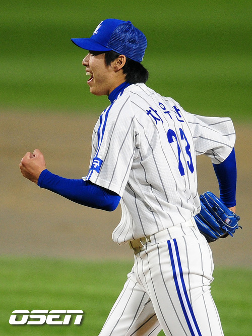 '2011 롯데카드 프로야구 한국시리즈' 5차전 삼성 라이온즈와 SK 와이번스의 경기, 2회말 2사 만루에서 삼성 차우찬이 SK 박진만을 삼진으로 잡고 주먹을 불끈 쥐고 있다.