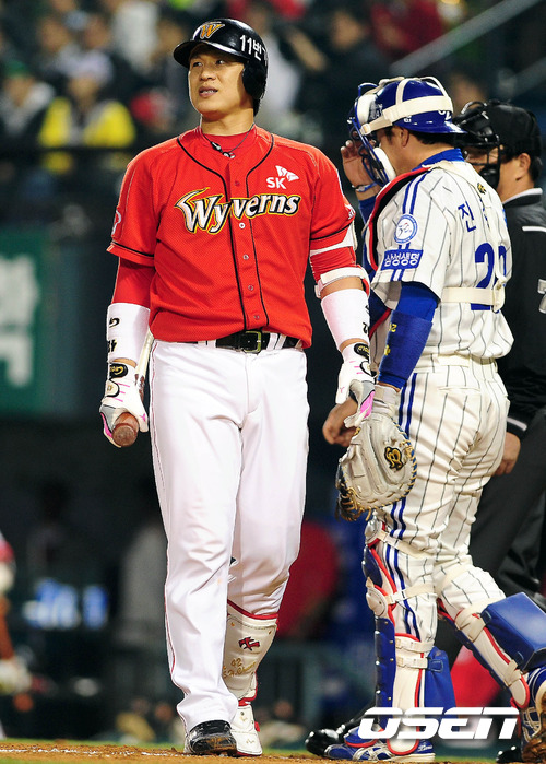 '2011 롯데카드 프로야구 한국시리즈' 5차전 삼성 라이온즈와 SK 와이번스의 경기 2회초 1사 만루 정상호가 잘맞은 타구가 파울이 되자 아쉬운 표정을 짓고 있다.