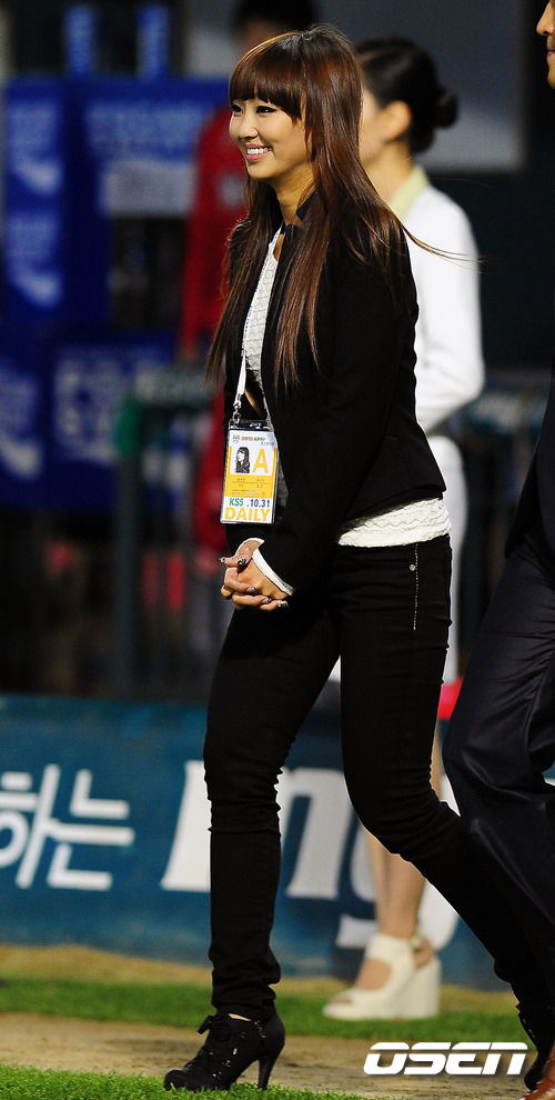 '2011 롯데카드 프로야구 한국시리즈' 5차전 삼성 라이온즈와 SK 와이번스의 경기 전 씨스타의 효린이 애국가를 부르기 위해 그라운드로 나오고 있다.