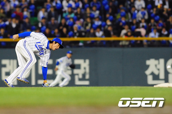 '2011 롯데카드 프로야구 한국시리즈' 5차전 삼성 라이온즈와 SK 와이번스의 경기 3회초 2사 주자 없는 상황에서 SK 최정의 타구를 삼성 유격수 김상수가 놓치고 있다.