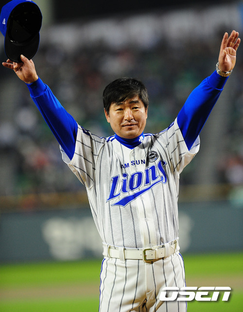 '2011 롯데카드 프로야구 한국시리즈' 5차전 삼성 라이온즈와 SK 와이번스의 경기전 삼성 류중일 감독이 팬들에게 인사를 하고 있다.