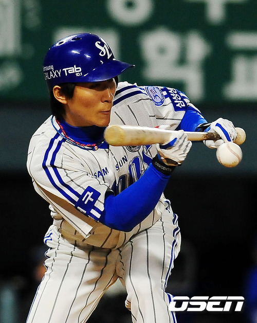 '2011 롯데카드 프로야구 한국시리즈' 5차전 삼성 라이온즈와 SK 와이번스의 경기에서 3회말 무사 주자 1루 삼성 배영섭이 희생번트에 성공하고 있다.