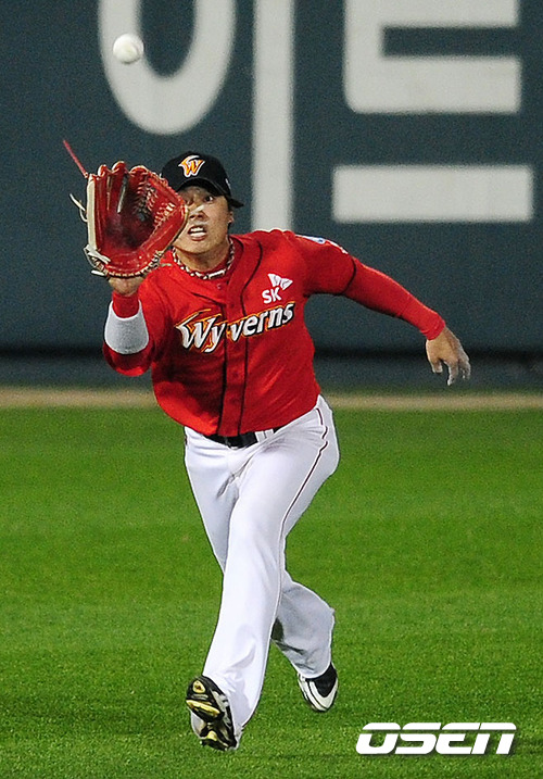 '2011 롯데카드 프로야구 한국시리즈' 5차전 삼성 라이온즈와 SK 와이번스의 경기, 3회말 2사 1,2루에서 SK 박재상이 삼성 최형우의 타구를 잡아내고 있다.