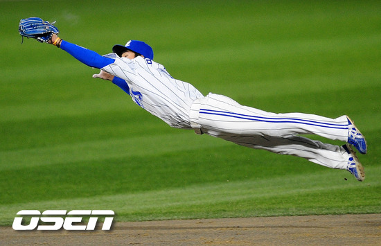 '2011 롯데카드 프로야구 한국시리즈' 5차전 삼성 라이온즈와 SK 와이번스의 경기, 4회초 1사에서 삼성 김상수가 SK 최동수의 타구를 몸을 날려 잡아내고 있다.
