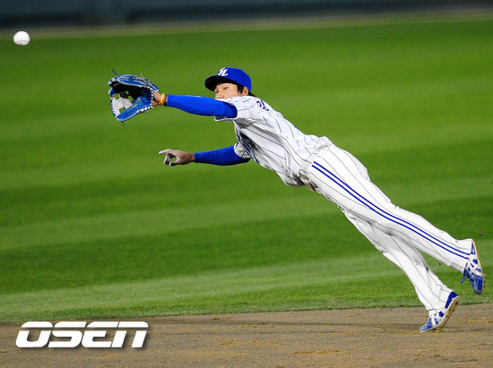 '2011 롯데카드 프로야구 한국시리즈' 5차전 삼성 라이온즈와 SK 와이번스의 경기, 4회초 1사에서 삼성 김상수가 SK 최동수의 타구를 몸을 날려 잡아내고 있다.