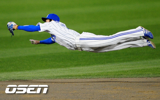 '2011 롯데카드 프로야구 한국시리즈' 5차전 삼성 라이온즈와 SK 와이번스의 경기, 4회초 1사에서 삼성 김상수가 SK 최동수의 타구를 몸을 날려 잡아내고 있다.