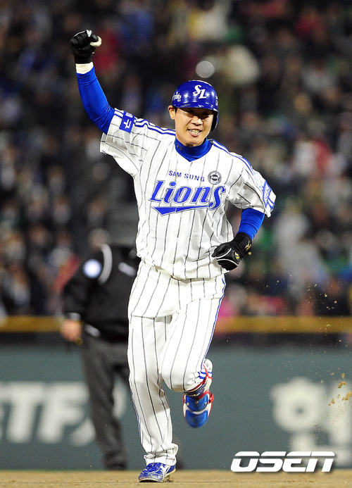 '2011 롯데카드 프로야구 한국시리즈' 5차전 삼성 라이온즈와 SK 와이번스의 경기 4회말 2사 강봉규가 좌측 펜스를 넘어가는 솔로 홈런을 치고 환호 하고 있다.