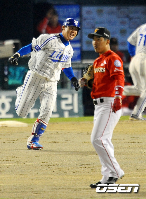 '2011 롯데카드 프로야구 한국시리즈' 5차전 삼성 라이온즈와 SK 와이번스의 경기 4회말 1사 삼성 강봉규가 선취 솔로홈런을 날리고 환호하고 있다.