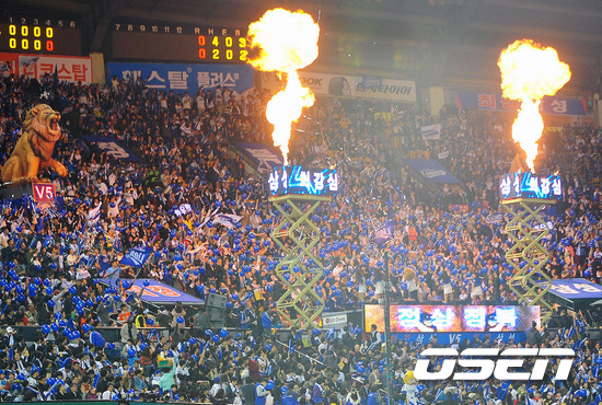 '2011 롯데카드 프로야구 한국시리즈' 5차전 삼성 라이온즈와 SK 와이번스의 경기에서 삼성이 불꽃을 사용한 응원을 펼치고 있다.