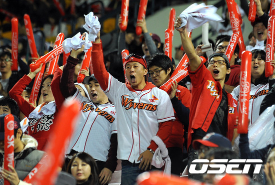 '2011 롯데카드 프로야구 한국시리즈' 5차전 삼성 라이온즈와 SK 와이번스의 경기, SK 팬들이 열띤 응원을 펼치고 있다.