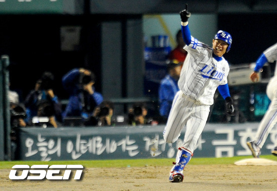 '2011 롯데카드 프로야구 한국시리즈' 5차전 삼성 라이온즈와 SK 와이번스의 경기 4회말 1사 삼성 강봉규가 선취 솔로홈런을 날리고 환호하고 있다.