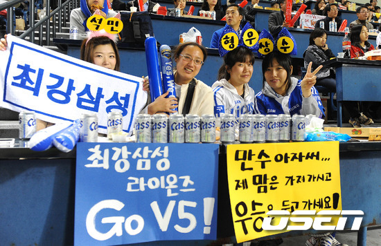 '2011 롯데카드 프로야구 한국시리즈' 5차전 삼성 라이온즈와 SK 와이번스의 경기, 4회초 잠실야구장을 찾은 삼성 야구팬들이 열띤 응원을 펼치고 있다.
