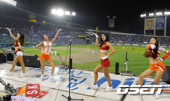 '2011 롯데카드 프로야구 한국시리즈' 5차전 삼성 라이온즈와 SK 와이번스의 경기, 4회말 SK 치어리더들이 화려한 공연을 펼치고 있다.