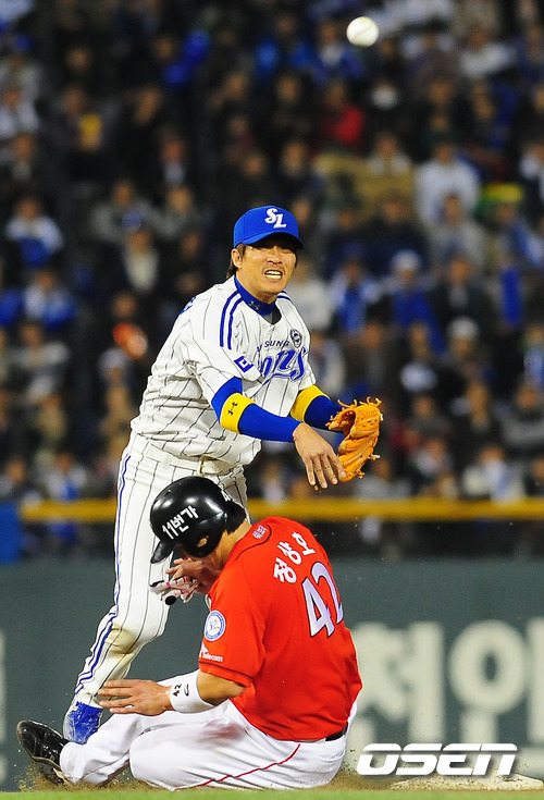'2011 롯데카드 프로야구 한국시리즈' 5차전 삼성 라이온즈와 SK 와이번스의 경기에서 7회초 1사 주자 1루 SK 박진만의 3루수 앞 병살타때 삼성 2루수 신명철이 1루 주자 정상호를 2루에서 포스 아웃 시킨 후 1루로 송구 하고 있다.