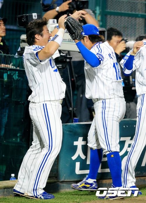 '2011 롯데카드 프로야구 한국시리즈' 5차전 삼성 라이온즈와 SK 와이번스의 경기, 7회초 1사 1루에서 삼성 박석민이 SK 박진만의 내야땅볼을 잡아 병살로 처리하고 더그아웃에서 최형우와 기뻐하고 있다.