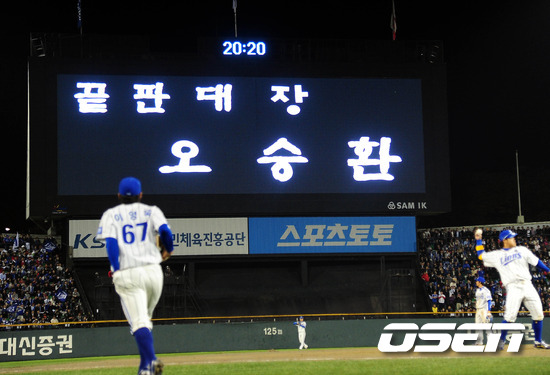 '2011 롯데카드 프로야구 한국시리즈' 5차전 삼성 라이온즈와 SK 와이번스의 경기 8회초 2사 1,2루 끝판대장 오승환이 마운드에 오르자 전광판에 그의 별명이 나타나고 있다.