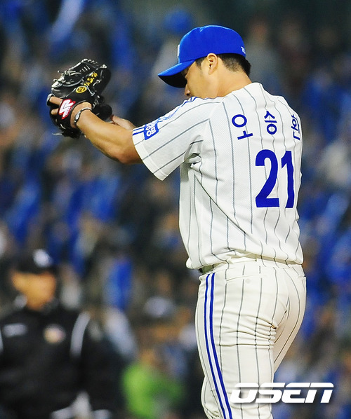 '2011 롯데카드 프로야구 한국시리즈' 5차전 삼성 라이온즈와 SK 와이번스의 경기에서 8회초 2사 주자 1,2루 SK 안치용 타석에서 마운드에 오른 삼성 오승환이 안치용을 플라이아웃 처리한 후 박수를 치고 있다.