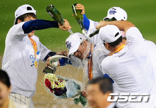 삼성 류중일 감독이 선수들에게 샴페인 세례를 받고 있다. /jpnews@osen.co.kr
