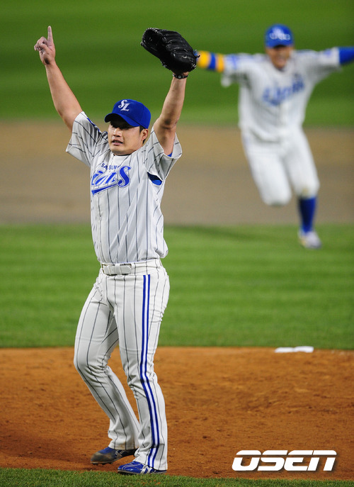 삼성 오승환이 우승을 확정지으며 두팔벌려 기뻐하고 있다. /jpnews@osen.co.kr