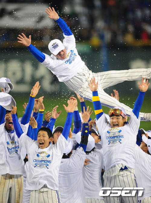 우승을 확정지은 삼성 류중일 감독이 헹가래를 받으며 기뻐하고 있다. /jpnews@osen.co.kr