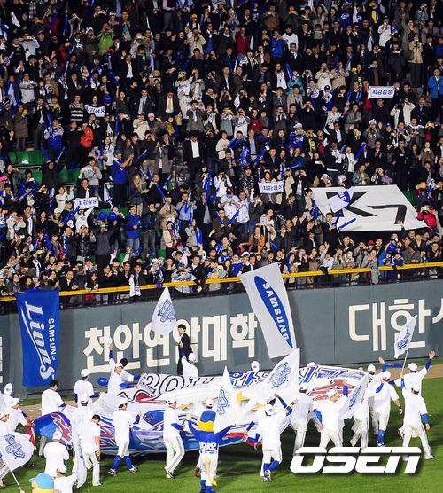 [OSEN=잠실 ,백승철 인턴기자] 삼성 라이온즈가 한국시리즈 챔피언컵을 거머쥐었다. 삼성은 31일 잠실구장서 열린 SK 와이번스와의 2011 한국시리즈 5차전서 강봉규의 4회 선제 결승 좌월 솔로포 등을 앞세워 1-0으로 승리했다. 시리즈 전적 4승 1패로 삼성은 2006년 이후 5년 만에 왕좌에 올랐다. 1985년 전후반기 통합 우승까지 합치면 통산 5번째 패권을 잡았다.