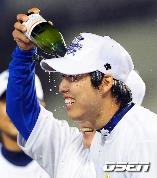 차우찬이 샴페인 세례를 받고 있다. /spjj@osen.co.kr