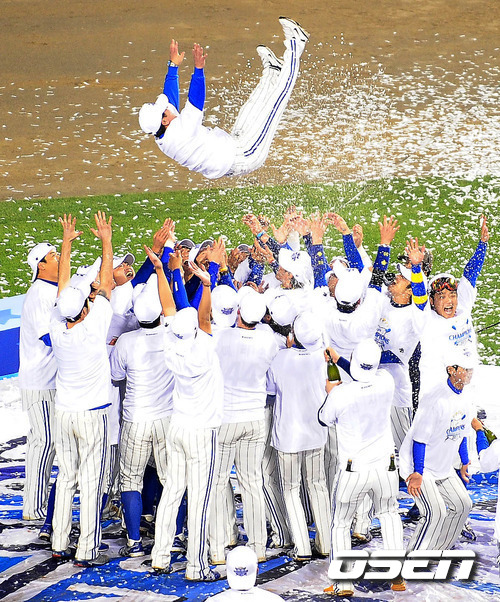 경기 종료 후 류중일 감독이 선수들로 부터 행가래를 받고 있다. /baik@osen.co.kr