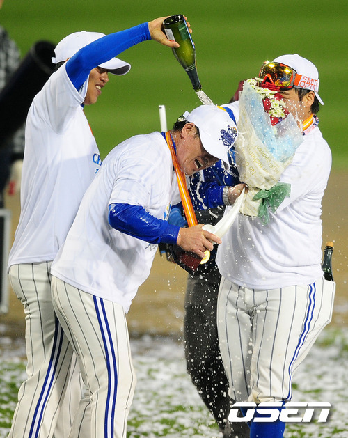 최우수 감독상을 수상한 삼성 류중일 감독이 선수들에게 샴페인 세례를 받으며 기뻐하고 있다. /jpnews@osen.co.kr