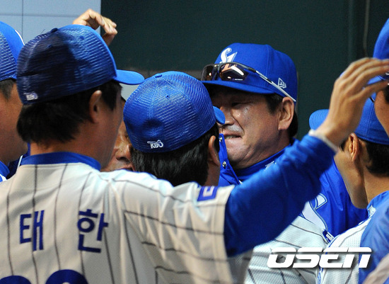 삼성의 우승이 확정되자 삼성 류중일 감독이 코칭스태프와 우승의 기쁨을 나누고 있다.