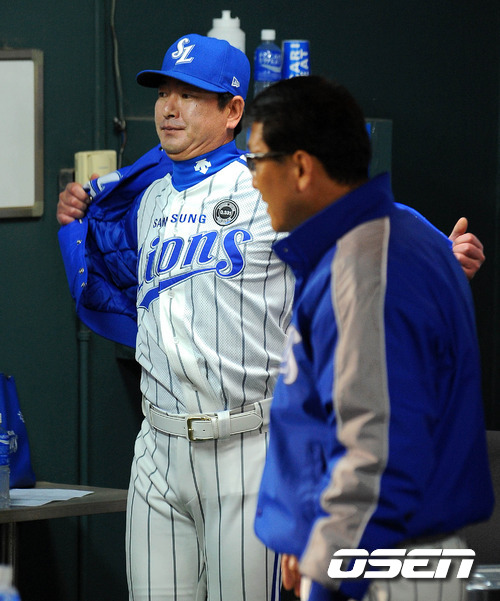 삼성 류중일 감독이 우승 티셔츠를 갈아입고 있다.