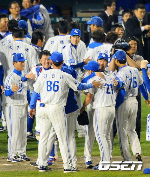 삼성 라이온즈가 한국시리즈 챔피언컵을 거머쥐었다. 삼성은 31일 잠실구장서 열린 SK 와이번스와의 2011 한국시리즈 5차전서 강봉규의 4회 선제 결승 좌월 솔로포 등을 앞세워 로 승리했다. 시리즈 전적 4승 1패로 삼성은 2006년 이후 5년 만에 왕좌에 올랐다. 1985년 전후반기 통합 우승까지 합치면 통산 5번째 패권을 잡았다.